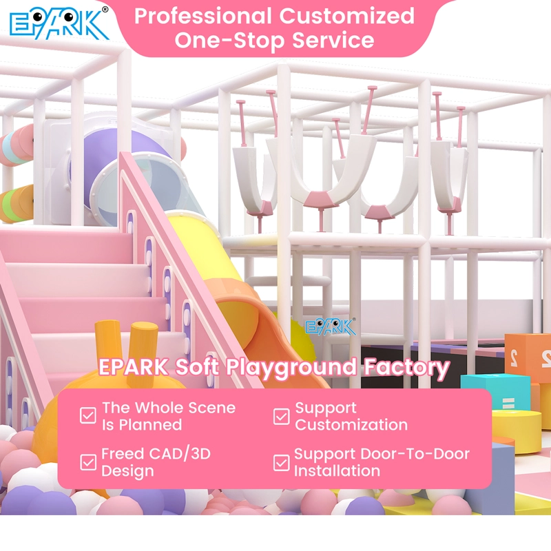 Picture a giant pastel macaron turned inside-out: the Soft Playground’s frame is wrapped in silky, milk-white vegan leather that reflects light like fresh icing. Columns wear triple-swirl sleeves—mint-green, blush-peach and butter-cream yellow—sewn with hidden matching zippers, so no dark line breaks the candy glow. Every edge is piped with 15 mm marshmallow-grey foam, giving the Soft Playground a cloud-soft silhouette that feels gentle even when you stare at it. Overhead, translucent opal skylights filter sun into a soft pink halo, turning the ball pool into a shimmering rose-gold lagoon and the foam pit into a vanilla mousse. From a distance the whole Soft Playground looks like one seamless, edible rainbow—inviting, photo-ready, and irresistibly huggable.