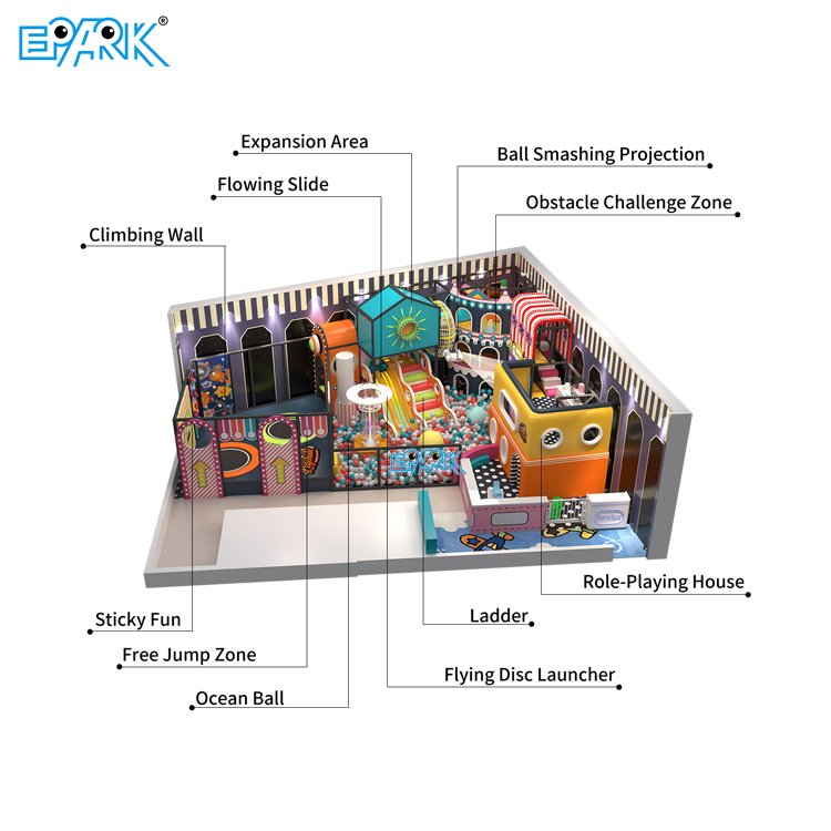 Our EPARK Soft Playground is a vibrant and engaging play environment designed to spark joy and encourage active play for children. The structure features a dynamic combination of bright, primary colors like bold reds, sunny yellows, and deep blues, interspersed with fun patterns and themes. The overall appearance is visually stimulating, inviting children to explore a world of adventure. The use of high-quality, colorful materials ensures the playground is not only attractive but also durable and long-lasting.