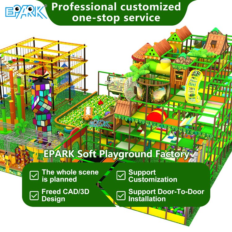 Our EPARK Soft Playground is a vibrant and engaging play environment designed to spark joy and encourage active play for children. The structure features a dynamic combination of bright, primary colors like bold reds, sunny yellows, and deep blues, interspersed with fun patterns and themes. The overall appearance is visually stimulating, inviting children to explore a world of adventure. The use of high-quality, colorful materials ensures the playground is not only attractive but also durable and long-lasting.