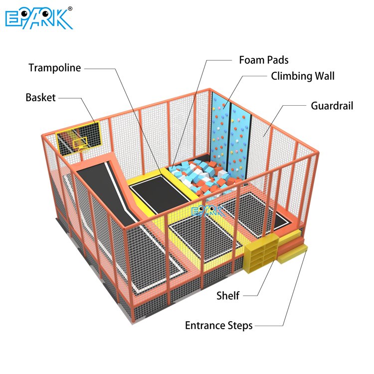 Inside the Naughty Castle, you will find a comprehensive range of play equipment designed for maximum fun and activity. The core structure includes high-performance trampolines, safe foam pits, challenging climbing walls, and secure guardrails. The area is accessorized with essential components like entrance steps and functional shelving units, creating a complete and immersive play environment for children.
